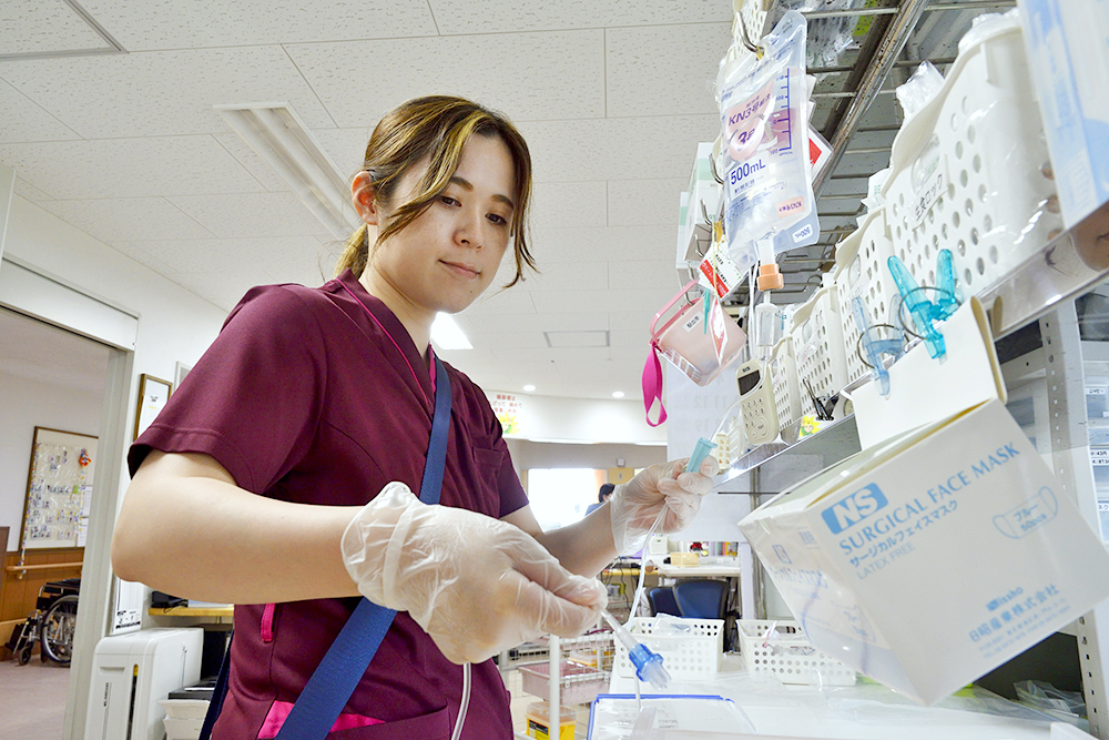現在の職場、地域包括ケア病棟での看護師の仕事は、患者様の日常生活の援助です。また、患者様とご家族に退院後の療養先のご希望をお聞きし、ソーシャルワーカーや退院支援看護師と相談して療養先を調整・選定するのも看護師の役割です。以前、患者様の奥様が在宅療養を希望されたケースがありました。患者様は胃ろうをされており、奥様は80代とご高齢でした。そのため在宅療養は難しいと考えましたが、退院支援看護師やリハビリ担当者と介護用品を選定し、拘縮(こうしゅく)予防の援助方法や、オムツ交換・体位交換、たんの吸引、経管栄養の手順などをご指導しました。また、要介護者の一時的な入院を受け入れるレスパイト入院(※)を提案しました。他職種と一緒に考え、制度を活用することで、奥様の思いに応えることができました。