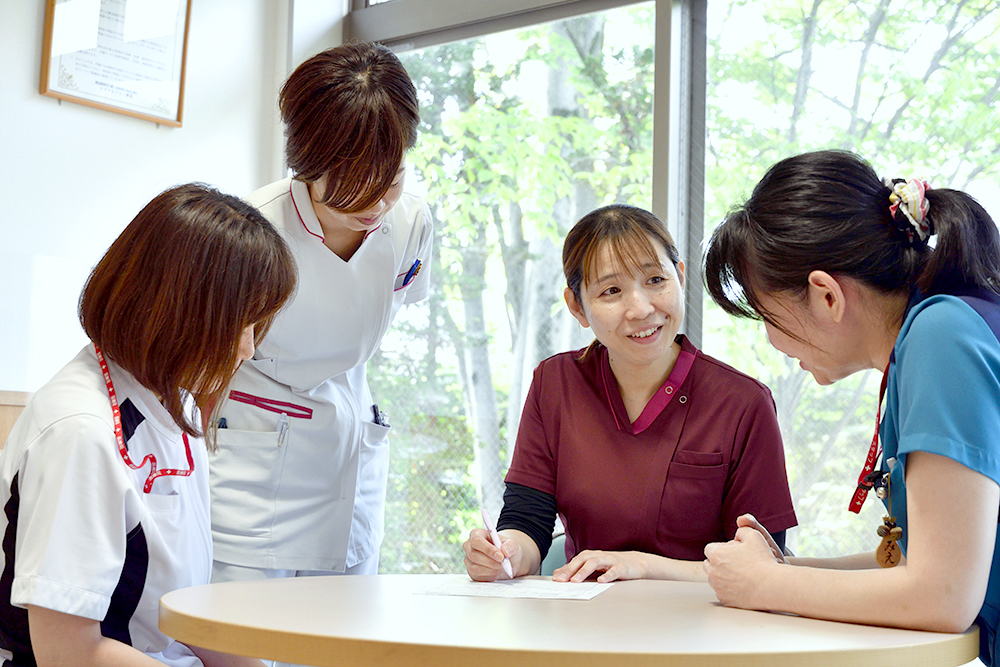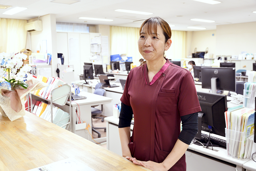 訪問看護ステーション・ちあきは、居宅介護支援事業所、ヘルパーステーションと事務所を共有しています。そのため、訪問看護の利用者様が抱えている困り事を相談しやすく、すぐに支援につなげられるといったメリットがあります。例えば、「買い物に行けない」「訪問看護料が払えない」とお困りの利用者様、「介護に疲れた」という介護者様もおられます。看護師はこうした困り事に直接、支援ができないので、居宅介護支援事業所のケアマネジャーに相談したり、ヘルパーステーションにつなげたりして、問題解決に当たっています。その結果、千秋病院のレスパイト入院制度(※)を活用した方、尾張健友会の施設に入所した方もおられます。利用者様をずっと見守りケアできるサービスや施設がそろっているのも、尾張健友会を利用するメリットだと思います。
