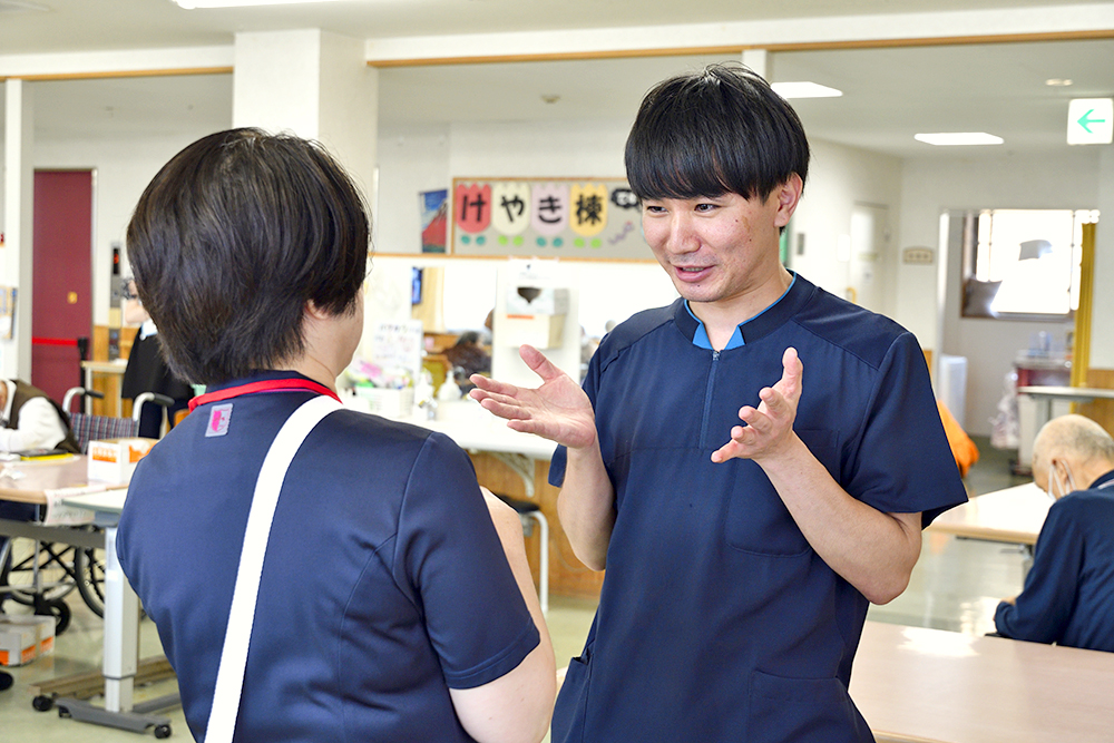 看護師や理学療法士とは密に連携しているので、対応が早く助かっています。例えば、理学療法士に利用者様の評価を依頼すると、すぐに来てくれます。また、看護師に薬について相談すると、医師につないでくれます。看護師は24時間常駐しているので、利用者様が急変したときも安心です。薬を飲むときの注意点など、アドバイスがもらえるのも心強く感じています。