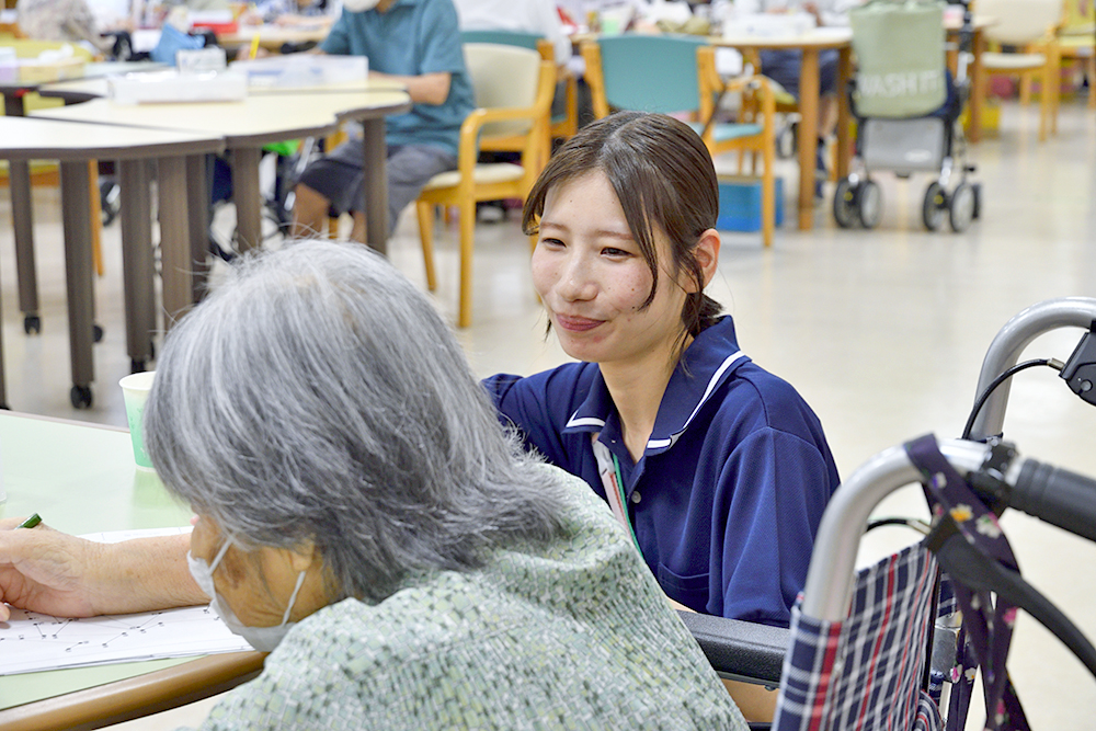 独身時代は夜勤のある小規模多機能ホームに勤務していたので、育休明けにデイサービスに異動になったときは不安でした。でも、この部署は夜勤がない上に、スタッフの多くが育児経験者で子育て世代に理解があるので、小さな子どもがいても無理なく仕事を続けられる環境です。グループ内にさまざまな施設があり、ライフステージに合った働き方ができるのも、尾張健友会で働く魅力だと思います。